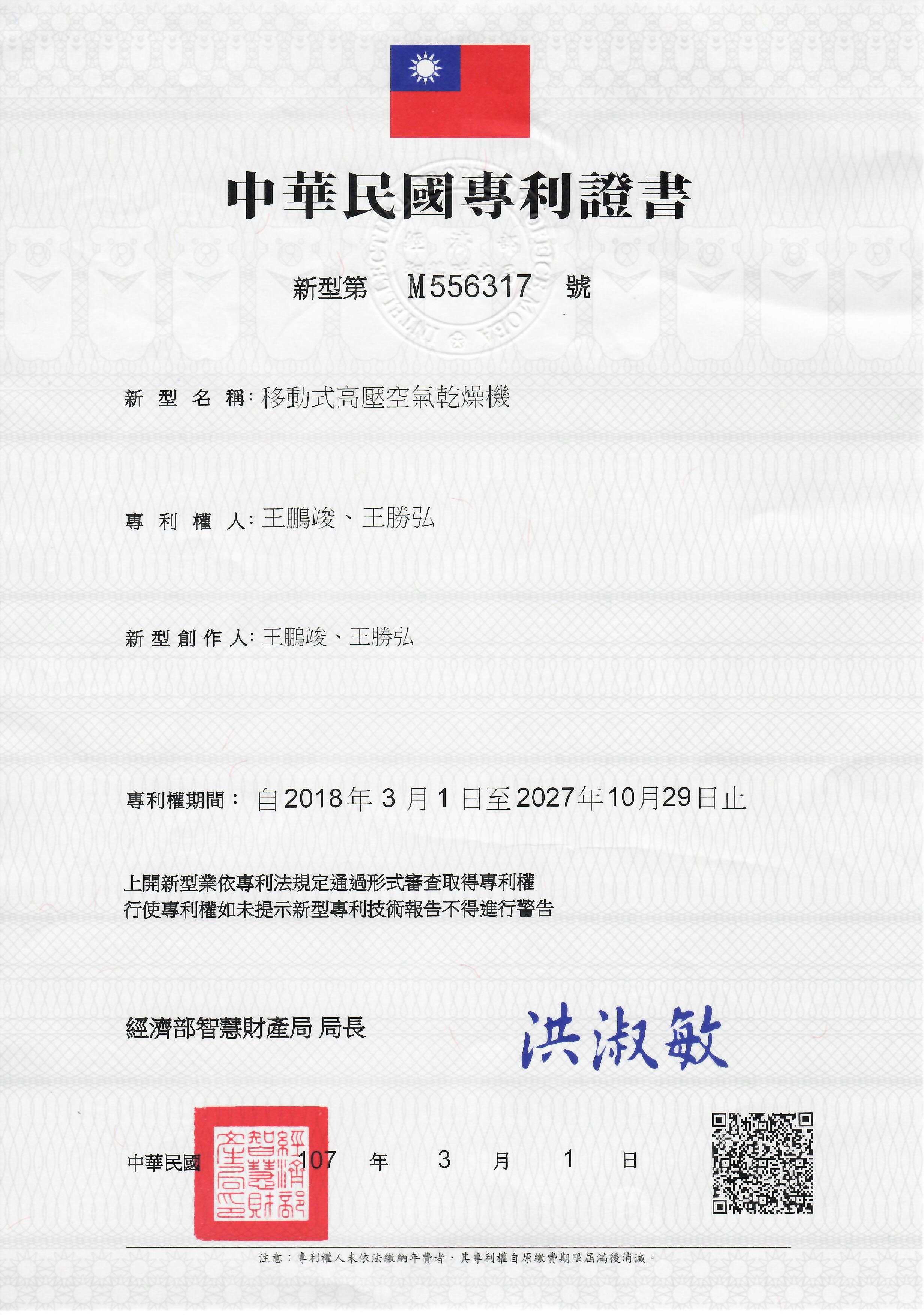為提供設備端更方便且省空間的物理空壓式乾燥機,由本公司總經理率領研發團隊工程師對物理空壓式乾燥機外型重新設計,推出設備端物理空壓式乾燥機,加上滾輪裝置及握把方便使用者跟著設備移動。除設備端使用外還可提供小馬力的空壓機使用,消除小馬力空壓機對龐大體積物理空壓式乾燥機的不便感。可移動及不須額外能源消耗的特點,可提供特殊清淨壓縮空氣需求者使用。2018年3月以移動式高壓空氣乾燥機的新型名稱榮獲中華民國新型專利。
